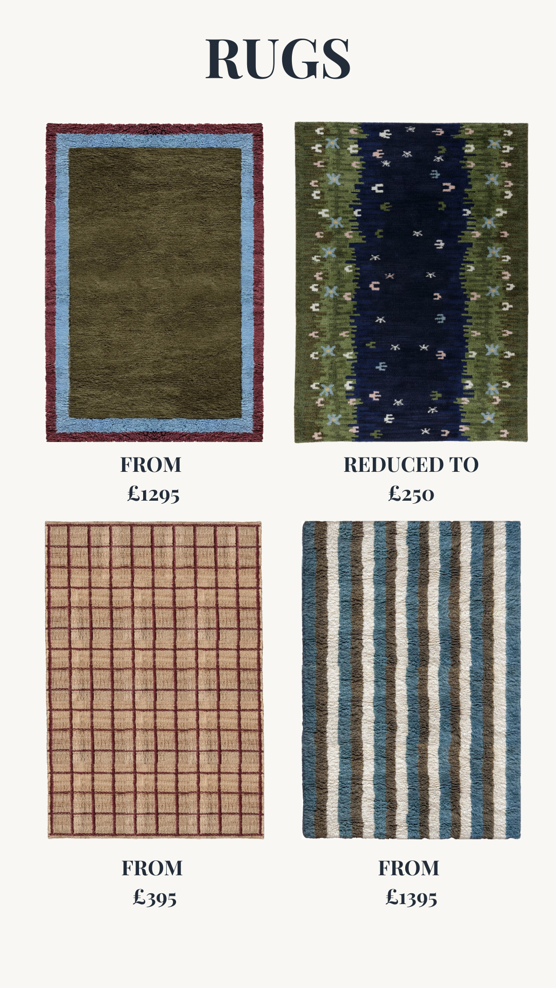 And then we have some rugs. Rugs p*ss me off - there is so little available in the land of Middle Ground. Cheap rugs may look good for a bit but they never last, I have made this mistake. They fluff, pile and don’t wear well at all. Ruggable rugs are getting better but are quite obviously Ruggable - they do not pass as regular rugs, even the tufted versions. Then there is the other extreme, where a rug is almost a piece of art and therefore the price of a real David Shrigley. In which case, I’d rather buy the Shrigley. Here are the few I found that weren’t £10,000. They are hardly a bargain, but didn’t cause me to have an aneurism.