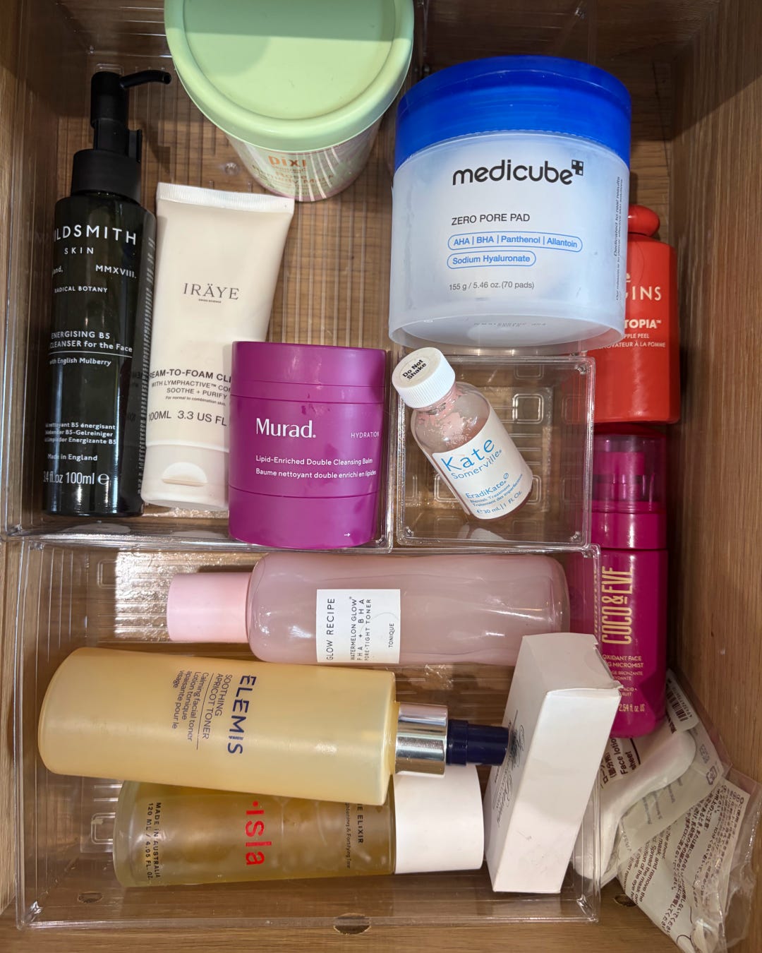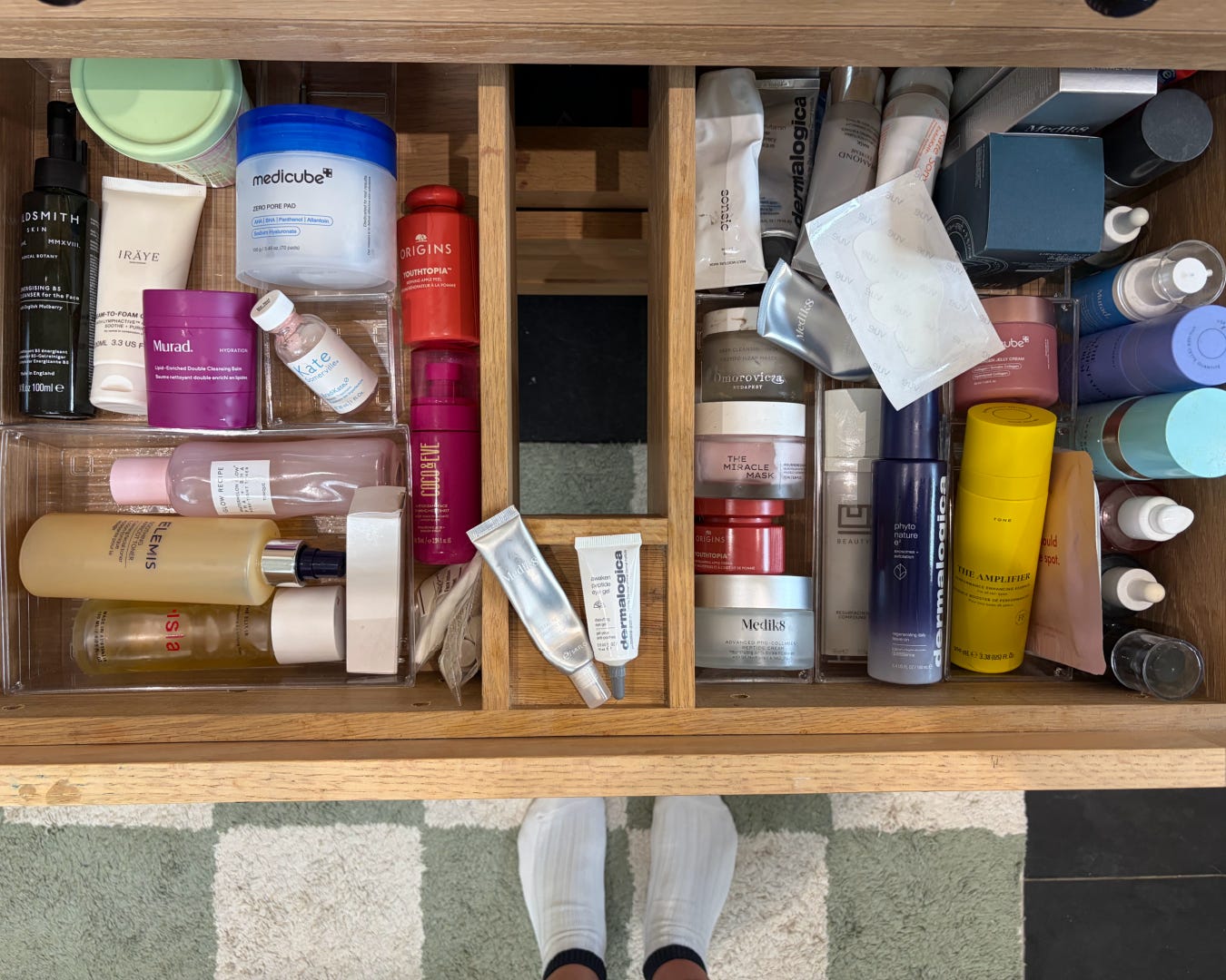 origins apple peel - I love this entire range (you’ll notice the moisturiser is on the other side of the drawer). This brand should never be forgotten, it does organic, plant based stuff so well. Incredible powerful. I use this toner when my skin just needs some extra help (particularly good using one of the muji pads I mentioned above). Gorgeous - would recommend to anyone who’s looking to get into skincare and wants a safe starting place.